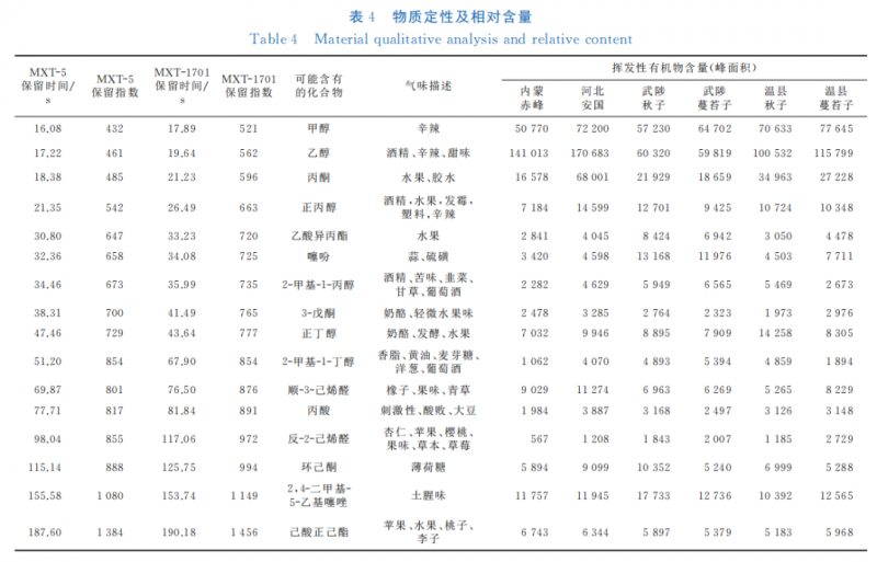 用AroChembase數據庫對樣品中的揮發性化合物進行定性分析,其可能含有的化合物如 表 4所 示。由表4可知,不同牛膝種子樣品的揮發性氣味化合物在含量上存在差異。牛膝種子中揮發性化合 物etha-nol平均含量最高,峰面積范圍為59819~170;揮發性化合物(E)-2-hexenal平均含量最低,峰面積范圍為567~1185。武陟秋子和蔓苔子的揮發性氣味化合物在含量上較為接近,溫縣秋子和蔓苔子的揮發性氣味化合物在含量上也較為接近,說明秋子與蔓苔子的揮發性氣味化合物較為相似。不同來源牛膝種子的氣味化合物含量差異較大,證明Heracles Ⅱ超快速氣相電子鼻能夠快速準確地識別出不同來源牛膝種子之間的差異,牛膝種子檢測提供了新技術。