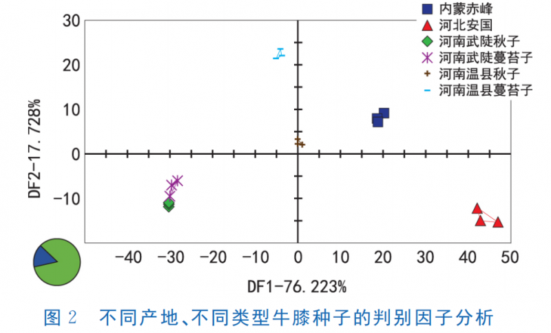 對不同產地、不同類型的牛膝種子進行判別因子分析,結果如圖2所示,6種樣品均能被較好地區分。武陟秋子與武陟蔓苔子較相近,二者區分效果較差。