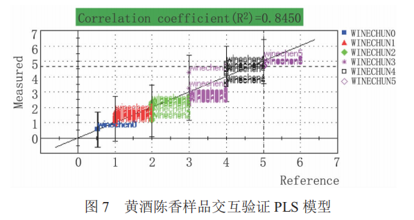 從表 1 可以看出, 所有樣品的醇香得分經交互驗證顯示,驗證準確率為 97.3 %。其中 25 號樣品醇香分值為5 分的酒樣,其預測得分略高,查得此樣品為 40 年陳釀,而 31 號樣品醇香分值為 5 分,預測結果相對接近,查得此樣品為 20 年陳釀。這可能是由于二者年份上的差異加上評分機制最高為 5 分,而導致預測結果略有偏離。在實際感官品評時,不影響其得到最高分值。