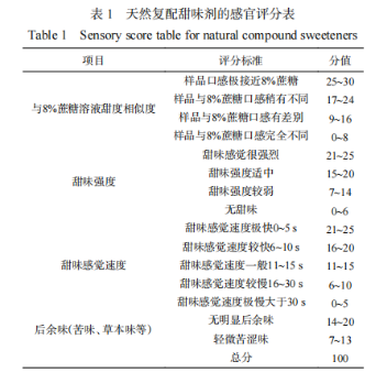 配制8%蔗糖溶液,以8%蔗糖溶液為基準,根據赤蘚糖醇、羅漢果甜苷、甜菊糖苷等倍甜比例(赤蘚糖醇:羅漢果甜苷=99.58:0.42,赤蘚糖醇:甜菊糖苷=99:0.05)進行復配混合,配制與8%蔗糖溶液等甜度的天然復配糖。采用感官評分(感官表如表1所示)和電子舌檢測相結合的方式,確定與8%蔗糖溶液同等甜度的天然復配糖配方,通過算出8%蔗糖溶液與同等甜度天然復配甜味劑的溶質質量分數之比,從而得出與4%、6%、10%、12%蔗糖溶液同等甜度的天然復配糖配方。