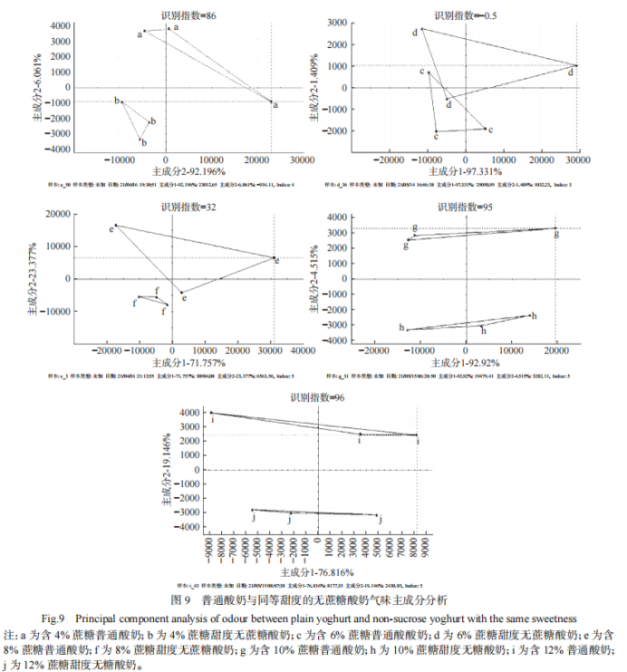 對發酵完成的無蔗糖酸奶和普通酸奶進行電子鼻氣味檢測,并進行主成分分析,如圖9所示。發酵結束后,蔗糖添加量在4%~12%的普通酸奶和添加同等甜度復配糖的無蔗糖酸奶,主成分1和主成分2之和大于95%,能夠很好的反映樣品的情況。4%、10%和12%識別指數分別為86、96和95,均大于85,故添加蔗糖濃度為4%、10%、12%的普通酸奶和添加同等甜度復配糖的無蔗糖酸奶氣味上具有顯著性差異(P<0.05);而6%、8%識別指數−0.5、32,均小于85。因此,添加蔗糖為6%、8%的普通酸奶和添加同等甜度復配糖的無蔗糖酸奶氣味更接近,無顯著性差異(P>0.05)。