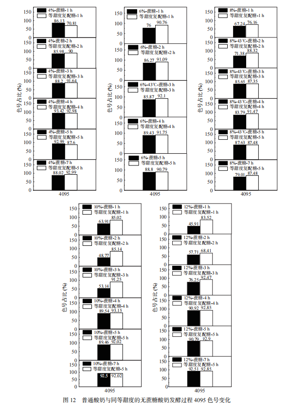 電子眼屬于視覺分析,模擬人眼對樣品的感知,分析樣品的整體顏色,以客觀數據展現出來。通過IRISVA400電子眼檢測添加復配糖的無蔗糖酸奶和添加蔗糖的普通酸奶發酵過程及發酵結束時顏色變化,如圖12所示。對占比最大的色號4095(乳白色)進行分析,發酵結束時不同濃度下的兩種酸奶4095所占比例均超過75%。主成分分析結果如圖13所示,蔗糖濃度為4%、10%、12%的普通酸奶和添加同等甜度復配糖的無蔗糖酸奶相比,發酵結束時兩種酸奶識別指數分別為91、92、95,均大于85,說明此三個濃度下兩種酸奶色澤上具有顯著性差異(P<0.05)。而蔗糖濃度為6%、8%的普通酸奶與添加同等甜度復配糖的無蔗糖酸奶相比,識別指數分別是72、−2,均小于85,說明這兩個濃度下的兩種酸奶在色澤上無顯著性差異(P>0.05)。因此,酸奶的色澤和添加的蔗糖、復配糖濃度不呈線性關系,是酸奶的一種表觀體現。