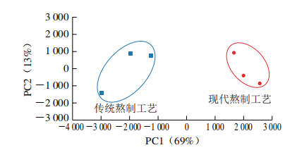 由圖6可知,PC1(69%)與PC2(13%)的累計貢獻率為82%(>70%),說明這兩個PC能夠代表不同熬制工藝“佛跳墻”中揮發性物質的特征信息。兩種熬制工藝的“佛跳墻”樣品各自聚類,說明不同熬制工藝“佛跳墻”樣品的揮發性風味物質可明顯區分。結論