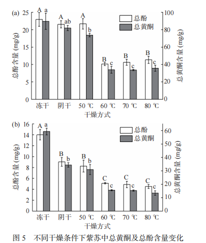 2.冷凍干燥、自然陰干及50℃干燥三種條件下總酚含量無顯著性差異(P>0.05),總黃酮含量雖有差異,但不甚明顯。當溫度提高至60℃后總酚及總黃酮含量明顯下降。對于紫蘇莖,冷凍干燥品的總酚及總黃酮含量均最高;其次為自然陰干品及50℃干燥品,且二者無顯著性差異(P>0.05),當溫度提高至60℃后,總酚及總黃酮含量明顯下降。