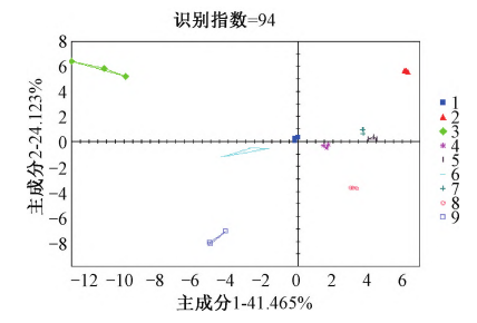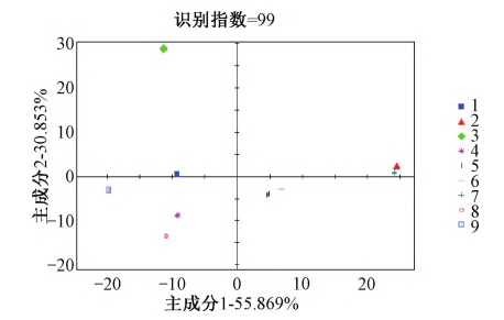 同一品種不同產地生地黃鑒別由圖4可知,PC1與PC2的貢獻率之和達到了95.057%,其識別指數達到99,說明基于氣味上的差異能有效區分不同產地地黃樣品。河南溫縣與甘肅所產“北京3號”各單獨分布在一個區域,與其他產區氣味差別較大;山西與陜西所產“北京3號”氣味差別較小,利用AroChemBases數據庫對篩選出的差異較大的色譜峰進行定性可知,生地黃氣味差異可能由于乙醛、乙醇、2,3?丁烷、乙腈、己醛等揮發性氣體含量差異引起,說明使用電子鼻能迅速區分同一品種不同產地生地黃。