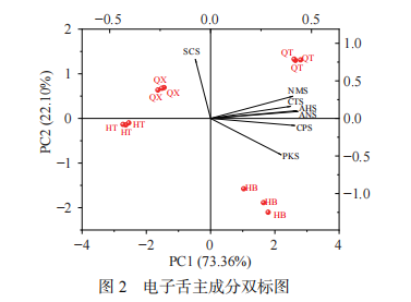 圖2顯示主成分PC1貢獻率為73.36%、PC2貢獻率為22.10%,表明主成分降維后數(shù)據(jù)能反映原數(shù)據(jù)的整體信息,四個樣品分布在四個象限中,無重疊,表明樣品之間存在較明顯差異性。主成分雙標(biāo)圖貢獻影響因子在圖中以線段表示,越靠近樣品所在坐標(biāo)軸,說明影響因子對其影響越大。樣品HT最靠近X軸,且樣品HT與QX相近,滋味相似;樣品HB距離其他樣品較遠,位于第四象限,其滋味差異主要體現(xiàn)在PC1上;結(jié)果表明,電子舌能明顯區(qū)分四個部位樣品,且樣品之間滋味差異明顯。