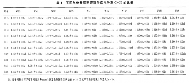 表 2至表 4為 10 個(gè)不同年份普洱熟茶的干茶、茶湯和葉底的具體的電導(dǎo)率 G/GO值。從表 2可知,對(duì)干茶香氣 G/GO值最大的傳感器是 w1w 和 W1S,其次是 w2w 和 W2S,其他 6個(gè)傳感器的 G/GO值較低;對(duì)茶湯香氣 G/GO值最大的傳 感器是 w1w 和 w2w ,其次是 W1S和 W5S,其他 6個(gè)傳感器的 G/GO值較低(表 3);葉底香氣 G/G0值的貢獻(xiàn)率大小順序與茶湯的相同,即為傳感器 w1w>w2w >w1s>w 5s(表4)。由表1所示的10個(gè)傳感器的性能可知,W1S傳感器對(duì)甲烷類揮發(fā) 性成分敏感,w1w ,w2w ,W2S和W 5S分別對(duì)硫化物,芳香成分、有機(jī)硫化物 ,乙醇和氮氧化合物等揮發(fā)性成分敏感。另外,不同年份普洱熟茶的香氣物質(zhì)不論 是干茶 、茶湯和葉底在其組成上基本一致 ,只是在干茶中乙醇?xì)怏w比和氮氧化合 物更為豐富。總體來(lái)看,上述幾類揮發(fā)性成分的含量在干茶中含量最高,茶湯次之 ,葉底最低;其中2011年干茶對(duì) w 1s,w1w ,w2w ,W2S和 W5S傳感器的電導(dǎo)率基本上是所有茶樣中最高的。隨著貯藏年份的增加,上述幾類揮發(fā)性成分的含量 在干茶和茶湯中呈顯著的上升趨勢(shì),在葉底中呈顯著的下降趨勢(shì)。