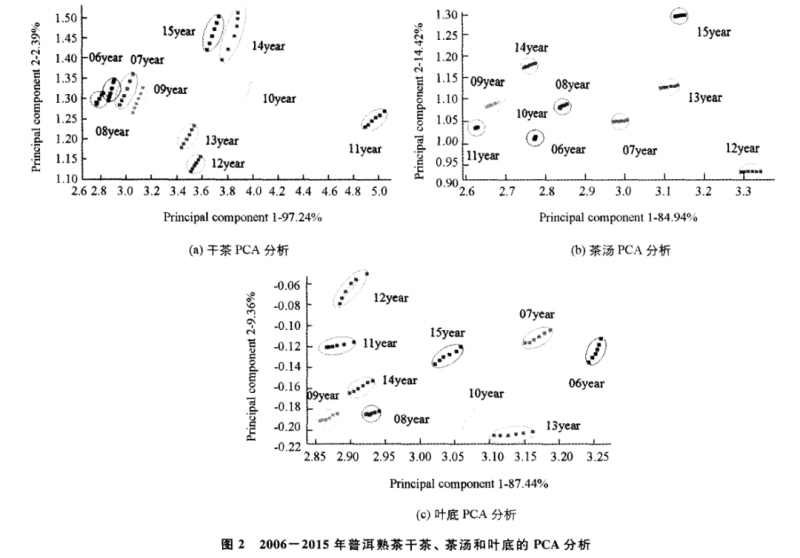 對(duì)干茶、茶湯和葉底香氣物質(zhì)進(jìn)行 PCA 分析 (選取 55~60S的 6個(gè)檢測(cè)信號(hào) ),干茶 (圖 2a)、茶湯 (圖2b)和葉底(圖 2c)的 PCA 分析結(jié)果顯示:干茶 、茶湯和葉底 的第一主成分區(qū)分貢獻(xiàn)率分別達(dá)到 97.24% ,84.94%和87.44 %,第二主成分區(qū)分 貢獻(xiàn)率分別達(dá)到 2.39% ,14.42% 和 9.36 %,兩個(gè)主成分區(qū)分的累計(jì)貢獻(xiàn)率分別 達(dá)到 99.63% ,99.36% 和 96.80% ,說(shuō)明這兩個(gè)主成分已經(jīng)基本代表了樣品的主 要信息特征,PCA分析具有可行性。另外,在 PCA 的散點(diǎn)圖中 ,不同年份普洱熟茶香氣成分的數(shù)據(jù)采集點(diǎn)所在的橢圓形區(qū)域除2006年 至 2009年 的干茶之間以及 2009年與2010年的茶湯之間有部分重疊外 (圖 2a,2b),其余的都分布在特定的區(qū)域中,說(shuō)明不同儲(chǔ)藏年份普洱熟茶的香氣有較大的差異,PCA分析可以將不同儲(chǔ)藏年份的普洱熟茶香氣歸類,并加以區(qū)分,且區(qū)分效果良好。