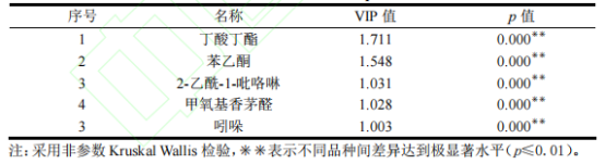 對于VIP>1的5種香氣成分在4種粳米中的含量差異進行非參數KruskalWallis檢驗。結果見表3,丁酸丁酯、苯乙酮、2-乙酰-1-吡咯啉、甲氧基香茅醛、吲哚在4種粳米中的含量均有極顯著差異(P≤0.01)。綜上,結合VIP>1的變量和非參數KruskalWallis檢驗,鑒定出5種香氣成分是區分4種東北粳米的關鍵香氣成分,分別為丁酸丁酯、苯乙酮、2-乙酰-1-吡咯啉、甲氧基香茅醛、吲哚。