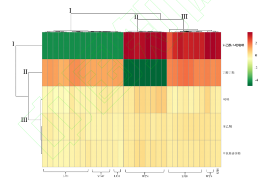 通過對5種香氣成分熱圖繪制并進行HCA,如圖5所示,對于香氣成分的聚類主要為3類,Ⅰ區香氣成分為2-乙酰-1-吡咯啉,它只在五優稻4號和綏粳18中檢出,能較好的區分香米和非香米。2-AP被認為是香米中特有的香氣成分,提供強烈的爆米花香氣。Ⅱ區香氣成分為丁酸丁酯,它在部分五優稻4號樣品中有所缺失,在其它樣品中均有檢出。Ⅲ區香氣成分為吲哚、苯乙酮和甲氧基香茅醛,它們在4種粳米樣品中均有一定分布,除五優稻4號吲哚含量略高一些外無明顯差異,有研究表明香米中吲哚及其衍生物含量高于非香米。 對于品種的聚類主要為3類,Ⅰ區主要為龍粳31和鹽豐47,它們之間雖有一定交錯分布,但從4種關鍵香氣成分含量上看差異不大,均缺失2-AP。Ⅱ區為五優稻4號,它的2-AP含量較高,缺失丁酸丁酯。Ⅲ區為綏粳18和部分的五優稻4號,它們擁有較高的2-AP和較高的丁酸丁酯,且五優稻4號的2-AP含量高于綏粳18。 總體上看,五優稻4號和綏粳18能進行一定區分,龍粳31和鹽豐47區分效果較差,從香米非香米角度觀察,香米樣品和非香米樣品能較好區分,這與上述OPLS-DA模型結果一致。