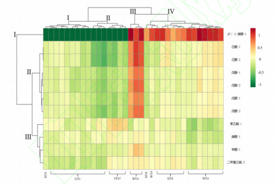 基于快速氣相電子鼻數據所得關鍵香氣成分層次聚類分析 通過對8種香氣成分熱圖繪制并進行HCA,如圖6所示,對于香氣成分的聚類主要為3類。Ⅰ區化合物為(E)-2-庚烯醛,僅通過MXT-5檢出,能較好地區分五優稻4號、綏粳18和龍粳31、鹽豐47,它在五優稻4號中含量最高,綏粳18次之,而在龍粳31和鹽豐47中未檢出;與電子鼻不同的是在GC-MS中,4種粳米均檢出(E)-2-庚烯醛,但在含量的分布規律上與電子鼻基本一致。(E)-2-庚烯醛是在蔓越莓、柑橘和土豆中檢測到的香氣成分。Ⅱ區香氣成分有己醛、戊醇、戊醛,它們在兩個色譜柱中均有檢出,能對五優稻4號、綏粳18和龍粳31、鹽豐47進行一定區分,總體含量上五優稻4號大于其它三個品種粳米。己醛和戊醛為亞油酸氧化的產物,提供果香和甜香,醇類為不飽和脂肪酸氧化的副產物,由醛的進一步分解形成,但醇類的氣味閾值一般較高,對香氣的整體貢獻較小。Ⅲ區化合物為僅通過MXT-5檢出的苯乙酮、庚醛、辛醛和僅通過MXT-1701檢出的二甲基三硫,它們在4種粳米中的分布并無明顯差異。二甲基三硫等硫化物被認為是在烹飪過程中產生的特征揮發物,在一些常見的米制品如年糕和米酒中也均有檢出。 對于品種的聚類主要分為4類。Ⅰ區和Ⅱ區主要為龍粳31和鹽豐47,它們的香氣成分含量較其它兩個品種的粳米偏低。Ⅲ區為部分的五優稻4號,它在(E)-2-庚烯醛、己醛、戊醇、戊醛的含量上顯著高于其它樣品。Ⅳ區為部分五優稻4號和綏粳18,它們的(E)-2-庚烯醛、己醛、戊醇、戊醛含量低于Ⅲ區,高于Ⅰ區和Ⅱ區,其中Ⅳ區五優稻4號的樣品在上述成分的含量上又略高于同區的綏粳18。總體上看,通過HeraclesNEO快速氣相電子鼻所得數據分析,香米和非香米樣品區分效果較好,五優稻4號香氣組分含量高于其它3個品種的粳米,這與GC-MS檢測數據分析結果一致。