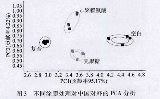如 3所示,采用PCA方法分析在貯藏第 l3d 時,不同涂膜處理方法對中國對蝦的電子鼻響應值。第 1主成分貢獻率為 95.17% ,第 2 主成分貢獻率為 4.22% ,兩者之和達到 99.39% ,可以有效的反映數據中的信息。圖 3 中各處理組之間較為分散,沒有任何交叉,說明主成分分析可以將不同涂膜處理的中國對蝦區分開來,其中復合涂膜組與空白組相隔最遠,說明經過復合涂膜的中國對蝦在相同的貯藏期內揮發性物質與空白組有明顯的區別,電子鼻檢測可以很好的反應此現象。