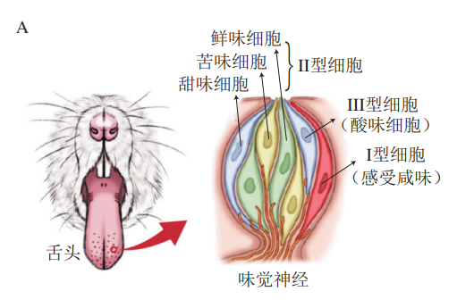 味蕾是人體的味覺感受器,其超微結(jié)構(gòu)含有多種味覺細(xì)胞,負(fù)責(zé)感受甜、苦、咸、酸和鮮等風(fēng)味,在味覺感知的過程中起關(guān)鍵作用。味蕾的超微結(jié)構(gòu)如圖1A所示,苦、甜和鮮味刺激由II型細(xì)胞檢測,酸味刺激由III型細(xì)胞檢測,而檢測咸味刺激的味蕾細(xì)胞尚未明確,Chandrashekar等通過對嚙齒類動(dòng)物味覺細(xì)胞的研究發(fā)現(xiàn),咸味的感知主要與I型類膠質(zhì)細(xì)胞有關(guān)。咸味的感知途徑為刺激物作用于味覺細(xì)胞的頂端致使細(xì)胞膜發(fā)生去極化,產(chǎn)生動(dòng)作電位,從而釋放神經(jīng)遞質(zhì)并發(fā)生傳遞,最終傳入神經(jīng)反饋大腦。刺激物的不同,所引導(dǎo)的感知與傳遞不同。目前常見的咸味刺激物主要是以NaCl為主的金屬鹽類,但隨著研究的不斷深入,非金屬離子的咸味刺激物不斷涌現(xiàn)。非金屬離子類刺激物非金屬離子的咸味刺激物以氨基酸、核苷酸和小分子多肽為代表,其涉及受體和咸味傳導(dǎo)途徑復(fù)雜。