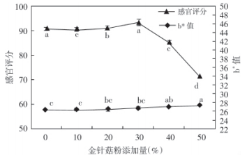 不同添加量的金針菇粉對金針菇魚松的感官評價和b*值的影響