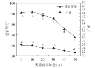 不同添加量的香菇粉對香菇魚松的感官評價和b*值的影響