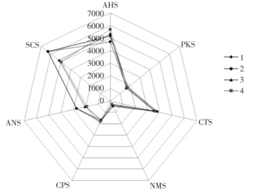 由圖4可知,電子舌的7個傳感器對不同菌菇類魚松樣品均能做出不同程度的響應。其中傳感器SCS和AHS的響應信號最強,傳感器NMS的響應信號最弱。各菌菇魚松的傳感器SCS、ANS和AHS的響應信號有明顯的差異,而傳感器CPS、NMS、CTS和PKS的響應值差異不明顯。