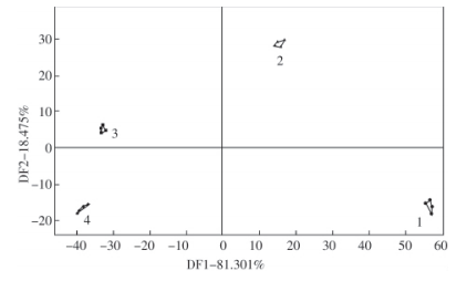 圖6 電子舌檢測不同菌菇魚松的DFA分析圖譜