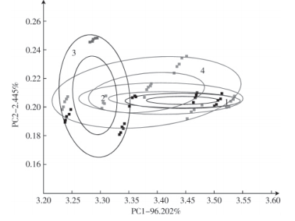 圖7 不同菌菇魚松電子鼻數據的PCA分析圖