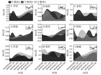 實驗人員觀察3種午餐肉時,情緒喚醒響應值維持在0.3左右,機體對樣品的反應強度類似。“中性”表示未引起實驗者情緒表達,“中性”值越高,情緒表達越低。“愉快”和“驚奇”的響應值越高,越能說明樣品的可接受度高;而“悲傷”、“憤怒”、“懼怕”和“厭惡”的響應值越高,說明樣品的可接受度越低。為了描述便利,本文將“中性”標為情緒壓制,“愉快”和“驚奇”2種情緒稱為積極情緒,“悲傷”、“憤怒”、“懼怕”和“厭惡”4種情緒稱為消極情緒。從視覺上分析,午餐肉2引起實驗者的情緒表達最高,午餐肉1最低;午餐肉3的積極情緒響應值明顯低于另外兩種,而午餐肉1比午餐肉2更能使人感到愉悅。從觀測時間上看,午餐肉1“愉快”響應值突降的時間正是午餐肉2“驚奇”響應值陡增的時間,說明情緒的分配是不平衡的,也可以反映出隨著觀察深入,午餐肉2的某些特征更能獲取實驗者的青睞。從消極情緒上看,3種午餐肉“憤怒”和“厭惡”的響應值接近,而“悲傷”和“懼怕”的響應值差異更顯著,而這兩種消極情緒都表明午餐肉3的接受度最低,午餐肉2的接受度最高。此結論和傳統的感官評價結論一致,都表明午餐肉2的外觀更能讓人相信食物“美味”。