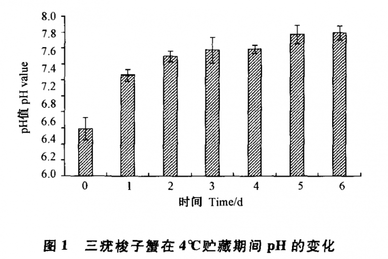 由圖 2可知,TVB-N 含量在貯藏初期變化緩慢,這是由于低溫 (4℃)和真空包裝條 件抑制了蟹肉中微生物的生長和繁殖,導(dǎo)致貯藏前期TVB-N含量增長緩慢 。從貯 藏第 4天開始TVB-N含量顯著上升,含量由34.44mg·100g-1 上升到貯藏第 6 天 的 60.76mg·l00g-1。GB2733—2005 規(guī)定新鮮海蟹的TVB-N含量值應(yīng)低于 25mg·100g-1,貯藏第 3天蟹肉的TVB-N含量為 22.26mg·100g-1,仍屬于新鮮蟹 肉,貯藏第 4天蟹肉的TVB-N含量高于規(guī)定標準,已腐敗變質(zhì),由此表明 TVB-N 可 以反映蟹肉鮮度的變化 。
