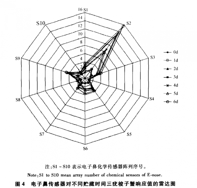電子鼻傳感器陣列由10種金屬氧化物半導(dǎo)體型化學(xué)傳感元件組成,每型傳感元件所對應(yīng)的主要敏感物質(zhì)類型有一定的區(qū)別:s1一芳香成分;s2一氮氧化合物;s3一氨氣;S4一氫氣;s5一烷烴芳香成分;s6一甲烷;s7一硫化物;S8一乙醇;s9一有機硫化物;S10一長鏈烷烴。由圖 4可知,s2、s3、s5、s9號傳感器的響應(yīng)值較高 ,s4、s8、S10號傳感器響應(yīng)值較小,表明蟹肉在貯藏過程中主要產(chǎn)生氮氧化合物 、氨氣、烷烴類芳香成分和含硫化合物等揮發(fā)性物質(zhì)。蟹肉中的含氮物質(zhì)和其它一些含硫蛋白質(zhì)在微生物和自溶酶的作用下分解產(chǎn)生大量的含氮化合物、氨氣和含硫化合物,使得蟹肉產(chǎn)不愉快的氣味。對傳感器的響應(yīng)值進行組間差異性分析,表明 s1、s2、s3、S5、s6、s7、S9、SI0 號傳感器組間差異極顯著 (P<0.01),且 s2、s6、s9號傳感器的響應(yīng)值均隨貯藏時間的延長不斷增大,s4、s8號傳感器組 問差異不顯著 (P>0.05)。表明蟹肉貯藏過程中氮氧化合物、氨、烷烴芳香成分 、甲烷、硫化物、有機硫化物的氣味差異顯著,氫氣 、乙醇的氣味差異不顯著。