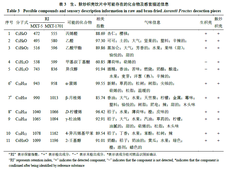 2.6.4 生、麩炒枳殼飲片氣味差異標(biāo)志物分析 將生、麩炒枳殼飲片在超快速氣相電子鼻色譜柱上采集到的色譜峰與Arochembase數(shù)據(jù)庫進行匹配分析,結(jié)果共鑒定出11個主要氣味化學(xué)成分,其中生枳殼飲片中有9個氣味化學(xué)成分,與麩炒枳殼相比,缺少甲基叔丁基醚、異戊醇2個成分。生、麩炒枳殼中可能存在的化合物及感官描述信息見表3。進一步分析已鑒定出的可能化合物氣味信息發(fā)現(xiàn),β-月桂烯、D-檸檬烯、γ-松油烯、4-異丙烯基甲苯、2-壬基醇具有“桔子、橙、檸檬”的味道,而桔子、橙、檸檬均為蕓香科柑橘屬植物,果皮均含有豐富的揮發(fā)油,β-月桂烯、D-檸檬烯和γ-松油烯為單萜類化合物,是揮發(fā)油的組成成分,具有特殊香氣,且D-檸檬烯主要存在于柑橘類植物中[18];本研究用枳殼飲片來源于蕓香科柑橘屬植物,表明已鑒定出的成分與枳殼含有的成分有較好的一致性。