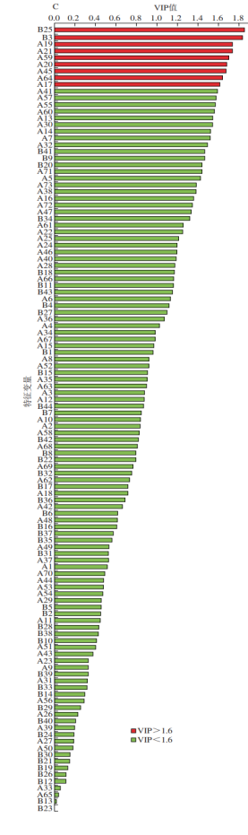 以GC-MS鑒定的73種揮發(fā)性成分相對(duì)含量數(shù)據(jù)集為基礎(chǔ),建立了工夫紅茶香氣品質(zhì)分類OPLS-DA模型,結(jié)果如圖2C所示,缺陷紅茶樣品與優(yōu)質(zhì)紅茶樣品分別位于X軸的負(fù)半軸和正半軸,兩組間分離明顯(R2Y=0.951,Q2=0.930),存在可視化的差異,與GC-E-Nose模型結(jié)果較好地吻合。置換檢驗(yàn)結(jié)果顯示,R2=0.356,Q2=-0.582(圖2D),回歸直線Q2與Y軸的截距小于0,表明模型未過擬合。該結(jié)果說明GC-MS結(jié)合多元統(tǒng)計(jì)分析可以實(shí)現(xiàn)缺陷紅茶和優(yōu)質(zhì)紅茶的準(zhǔn)確分類。