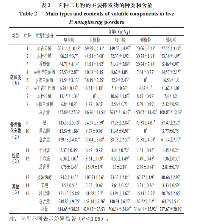 經(jīng)GC-MS 聯(lián)用技術(shù)檢測(cè)發(fā)現(xiàn),5 種不同部位三七粉揮發(fā)物共有31 種,包括萜烯類17 種,占比43.51%~56.21%;芳香族化合物2 種,占比13.75%~25.77%;烷烴類8 種,占比1.06%~3.51%;烯烴、酸類和醇類4 種,占比26.86%~39.23%。采用Duncan法進(jìn)行多重比較,主要的代表性揮發(fā)物見表2。