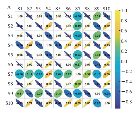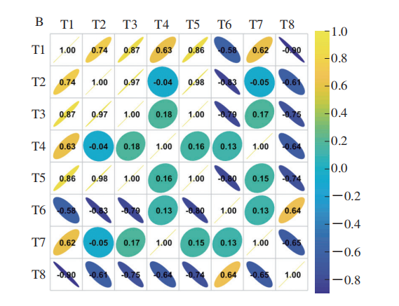 特征變量之間存在高沖突數(shù)據(jù)會(huì)影響特征融合數(shù)據(jù)的可靠性,繼而會(huì)影響分類模型建模結(jié)果,而Pearson相關(guān)系數(shù)在度量數(shù)據(jù)之間的沖突程度上表現(xiàn)良好。以整根粉10 根傳感器響應(yīng)值的INV特征數(shù)據(jù)和整根粉單個(gè)傳感器S2響應(yīng)值的8 個(gè)特征數(shù)據(jù)為例分析特征數(shù)據(jù)之間的冗余程度。圖2是這兩種不同維度數(shù)據(jù)各自的Pearson相關(guān)矩陣,其中相關(guān)系數(shù)的絕對(duì)值越接近1,說明二者之間的相關(guān)性越大;相關(guān)系數(shù)的大小在圖中用橢圓形球的寬窄和顏色表示,正負(fù)用橢圓形球的左偏和右偏表示。由圖2A可知,除S7、S9傳感器外,其余8 個(gè)傳感器之間都存在大量冗余信息;由圖2B可知,除了最大值特征T4和BFV b特征T7外,其余6 個(gè)特征數(shù)據(jù)之間存在大量冗余信息。所以,需要對(duì)特征數(shù)據(jù)進(jìn)行特征降維提高分類模型的精度。
