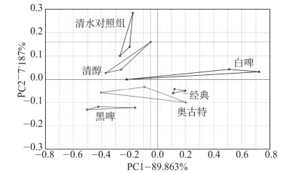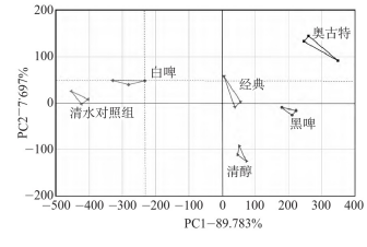 啤酒鴨電子舌檢測結果主成分分析如圖4。主成分1和主成分2的貢獻率分別為89.79%和7.70%,累計97.49%,說明這兩個主成分可以代表樣品整體信息。雖然不同啤酒鴨在電子舌傳感器上響應值差異較小,但利用主成分分析還是能將其明顯區分開,說明不同啤酒制作的啤酒鴨滋味存在差異,其中白啤組與其他組差異較大。