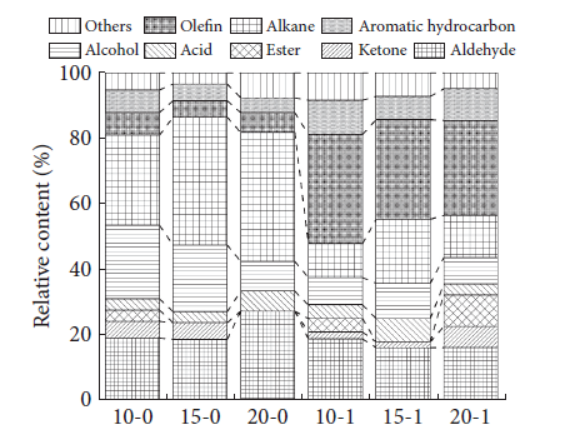與對照組(10-0、15-0和20-0)相比,孜然組(10-1、15-1和20-1)中醛類、醇類和烷烴類相對含量減少,酯類和烯烴類相對含量增加。烤羊肉餅中的主要揮發性風味化合物為醛類,包括戊醛、己醛、庚醛、辛醛、壬醛、癸醛、苯甲醛、(E)-2-辛烯醛等。加入孜然后,己醛含量顯著減少,這可能是由于孜然的抗氧化作用減少了關鍵醛類的氧化;孜然醛和茴香醛的含量明顯增加,這些是孜然中最豐富的成分,可能是由于在烤制過程中加入了孜然,使羊肉散發出柑橘和辛辣等香味。