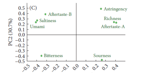 添加孜然的烤羊肉餅苦味和酸味下降,說明孜然可能通過釋放特有的揮發性風味化合物掩蓋或混合令人不愉快的味道。PC1和PC2的貢獻率分別為59.00%和30.70%,累積方差貢獻率為89.70%(>85%),說明PC1和PC2能夠反映大量有關樣本整體特征的信息。