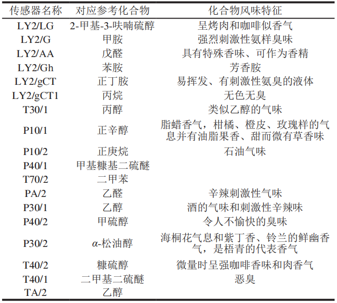 由圖2可知,電子鼻可以有效區(qū)分臨床乳房炎牛乳和健康牛乳樣品,PC1貢獻率達92.7%,可以很好地反映樣品的整體信息。電子鼻的18 個傳感器對兩種牛乳的風(fēng)味化合物皆有響應(yīng),并且響應(yīng)值各不相同。除LY2/LG傳感器響應(yīng)強度差異不顯著,其余17 個傳感器對兩種牛乳的響應(yīng)值均表現(xiàn)出顯著差異(P<0.05)。在健康牛乳中,T70/2、T40/2傳感器有顯著響應(yīng),對應(yīng)香氣增加。在乳房炎牛乳中,P30/1、LY2/gCT、P40/2、LY2/G等傳感器具有顯著響應(yīng),對應(yīng)的不愉快臭味增加。結(jié)合傳感器對應(yīng)參考化合物的風(fēng)味特征,由表2可知,奶牛患乳房炎后,其分泌的乳汁不新鮮,存在一定的刺激性氣味,加工價值降低。