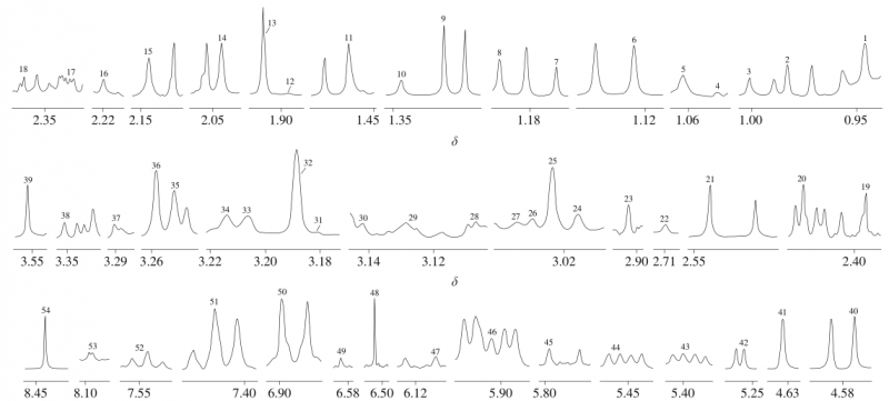 如圖4所示,利用基于H NMR的代謝組學(xué)技術(shù)從牛乳樣本中共精確定性和定量54 種分子,主要為氨基酸、有機酸、碳水化合物、核苷、核苷酸及其衍生物等化合物。
