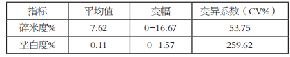 45個稻米樣品的碎米度平均值為7.62%,堊白度的平均值為0.11%,變異系數為259.62%,表明不同樣品間的堊白度差異較大,其中8號樣品最高。樣品6,9,11,12的碎米度和堊白度均較小,且其評級為優質一級,表明外觀品質優良。