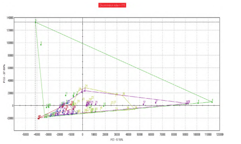 電子眼、電子鼻、電子舌的分析結果可以與人的感官評分結果進行擬合,從而實現未知樣品外觀表型數據及香味強度值、滋味值的預測,建立的聚類分析模型,可實現產地溯源及品種鑒定等聚類分析功能。通過同一樣品不同時期的數據采集,可以建立產品貨架期模型,實現對產品穩定性的有效評價。