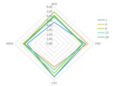 每個稻米樣品6次平行,計算各等級樣品AHS(酸味)、PKS(通用)、CTS(咸味)、NMS(鮮味)等4個味覺傳感器得分的平均值,得到雷達圖(如圖6所示)。不同等級稻米樣品對應4個傳感器的得分離散程度較大,表明4種傳感器可以較好的區分不同等級的稻米樣品。其中優質一級(分組4)AHS、PKS得分最高,NMS、CTS最小,三級(分組28)CTS得分最高。