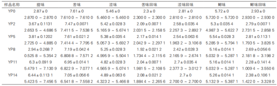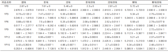 表1 三氯蔗糖與輔料矯味組合味覺信息測定值的均值 ± 標準差、95% 置信區間表2甜菊糖苷與輔料矯味組合味覺信息測定值的均值 ± 標準差、95% 置信區間表3阿斯巴甜與輔料矯味組合味覺信息測定值的均值 ± 標準差、95% 置信區間根據表1~3,選出甜味、鮮味、鮮味回味較高值的樣品,苦味、苦味回味、澀味、澀味回味較低值的樣品,即選出樣品 10、11、13、14 共 4 個樣品作為進一步研究的對象,篩選結果見表4。