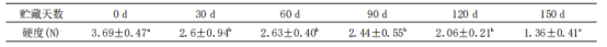 由表2可知,隨著凍藏時(shí)間的延長,紅燒肉的硬度持續(xù)降低,其中30d凍藏與新鮮的紅燒肉有顯著變化(P<0.05),30d至90d無顯著變化(P>0.05),而貯藏120d和150d與此前均有顯著變化(P<0.05)。凍藏30d,紅燒肉的硬度即明顯下降,凍藏150d自然解凍后的紅燒肉硬度下降至1.36N,這可能是因?yàn)閮霾剡^程中冰晶對肌細(xì)胞和肌肉纖維的破壞程度加重,引起豬肉中結(jié)合水和不易流動水的遷移與損失,從而引起紅燒肉質(zhì)構(gòu)品質(zhì)發(fā)生劣變。