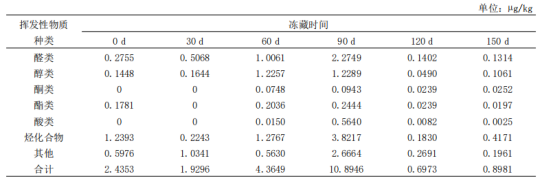 新鮮紅燒肉至150d揮發(fā)性物質(zhì)分別為57種、72種、49種、60種、66種、57種。整個(gè)貯藏期醛類物質(zhì)和酸類物質(zhì)種類數(shù)量先增加再減少,醇類、烴化合物和其他類揮發(fā)性物質(zhì)數(shù)量呈現(xiàn)先增多然后減少再增多的現(xiàn)象,酮類物質(zhì)種類數(shù)量隨時(shí)間增加。但各個(gè)貯藏期各類揮發(fā)性物質(zhì)的含量呈現(xiàn)先上升再下降的現(xiàn)象,其中120d起于之后的兩個(gè)貯藏期相比揮發(fā)性物質(zhì)含量有較大的降低,表明氣味隨凍藏時(shí)間的延長,前期變化小,而120d后風(fēng)味有所衰減,但衰減程度不大,對整體風(fēng)味品質(zhì)影響不大。