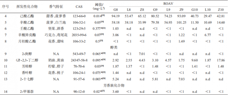 為了進(jìn)一步明確上述主要揮發(fā)性風(fēng)味成分中對(duì)風(fēng)味的呈現(xiàn)有突出貢獻(xiàn)的物質(zhì),對(duì)這些樣品中的揮發(fā)性風(fēng)味成分進(jìn)行ROAV分析,火龍果發(fā)酵酒樣品的ROAV見(jiàn)表4。