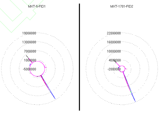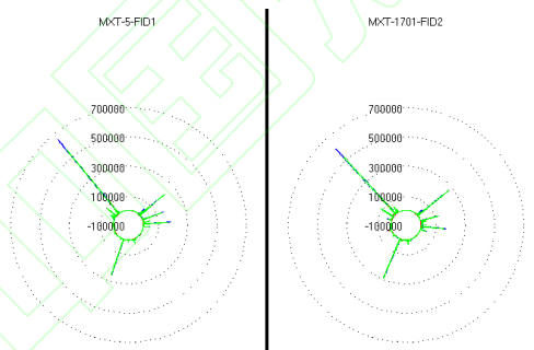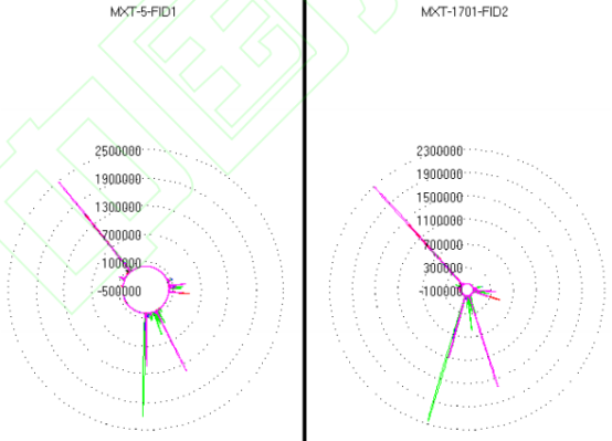 將GC數據進行同組疊加處理可以更清晰地觀察組內共有特征和細微差異,有助于識別同組樣本中普遍存在的化合物及其相對含量。圖2~圖9為各組(組1~組4)沒藥樣品原始GC疊加圖和雷達圖疊加圖,GC疊加圖分別展示MXT-5非極性毛細管柱與MXT-1701中極性毛細管柱結果,雷達圖也可以看出組間和組內沒藥峰面積和保留時間的差異。組1(JZ1∼JZ4、JZ6)、組2、組3、組4(K1、M5、J1、W1、JZ5)在各自的GC疊加圖和雷達圖疊加圖中均呈現出相似特征:出峰時間差異不大、峰面積差異較大。