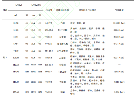 各組沒藥中可能含有的化合物信息及其氣味描述見表2。該表還提供了這些化合物在不同介質中的氣味閾值數據。
