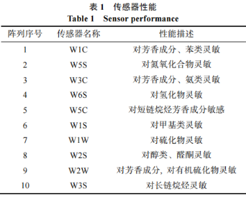 傳感器清洗時間180s,每個酒樣8mL,每隔1s取1次樣,連續測定時間90s,內部流量300mL/min,進樣流量200mL/min。傳感器對不同物質的性能如表1所示。