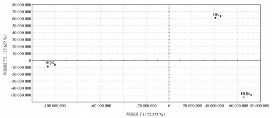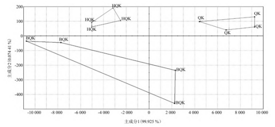 圖1 3種色澤氣流膨化青稞米的電子鼻PCA分析圖