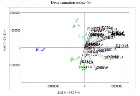 主成分分析(Principal Component Analysis,PCA)是一種常用統計分析方法,它可以將多個變量轉換為少數幾個主成分,從而簡化數據分析。本研究使用PCA算法對電子鼻采集的原始數據進行分析,通過計算主成分識別指數(Discrimination Index,DI)和貢獻率來識別變量。通過PCA分析,可以有效地揭示不同產地草果樣品氣味特征的差異。第一主成分(PC1)與第二主成分(PC2)的區分貢獻率之和為99.58%(圖4),表明這兩個主成分足以解釋10種不同產地草果樣品間的絕大部分的氣味差異,驗證了PCA模型能夠非常好地反映不同產地草果樣品間的氣味差異。識別指數(DI)是一種量化指標,用于衡量數據集或實驗結果中不同樣品或樣本之間的區分度。DI的數值大小直接關聯于數據集中樣本間的差異性。DI值越大,表示數據集中不同樣品或樣本之間的區分度越高,即模型或實驗方法的區分效果越好。草果樣品在主成分分析圖上的DI值達到89,進一步表明基于氣味特征的差異可以有效地區分10種不同產地的草果樣品。